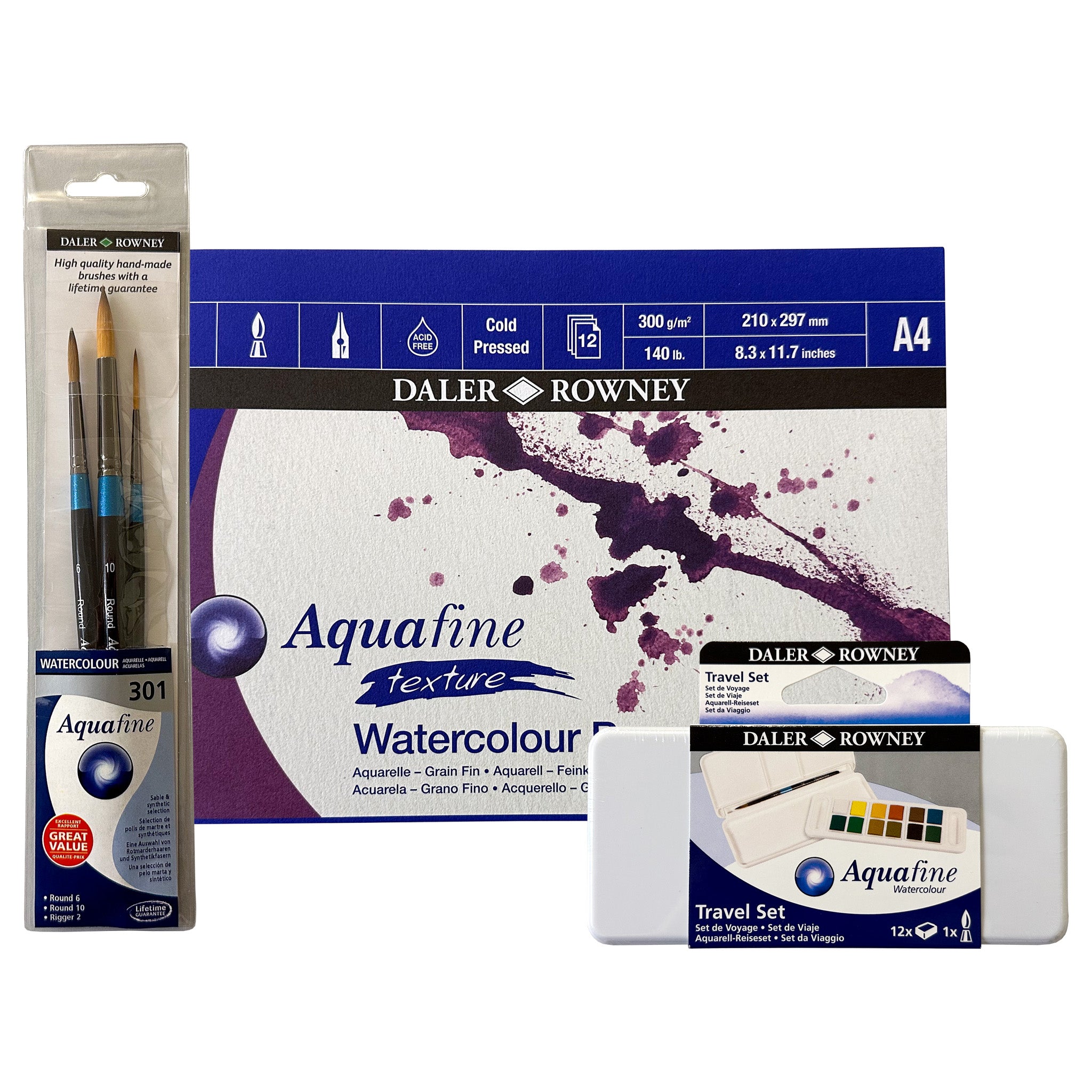 The Daler Rowney Aquafine Travel Set Bundle is an economical yet high quality set of items that will enable even a complete beginner to achieve amazing results. This bundle includes everything you will need to begin using this versatile medium. Included is the Aquafine Travel Paint Set of 12 Half Pans. The pans in this set contain an extremely high pigment content and are free-flowing, able to produce vibrant results when utilised with the Aquafine brushes included in this set. The Aquafine 301 Aquafine Brush Set is a specific synthetic blend to work perfectly with the paints. The pad incorporated in this bundle deal is an A4 Aquafine Watercolour Painting Pad, with 12 sheets of 300 GSM high quality cold pressed paper.
