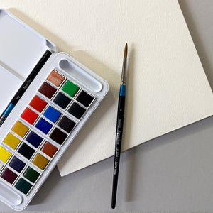 Suitable for a complete beginner or a seasoned veteran, this watercolour set is aimed at anyone interested in exploring this versatile medium. The travel set features a large amount of mixing space, fantastic for learning the different mixing processes available. The brushes are designed for use with watercolour but can also be used with a variety of wet media such as Gouache, Ink or loose flowing acrylics. In addition the paper in the pad can also be used in this manner and is not simply limited to watercolour usage.