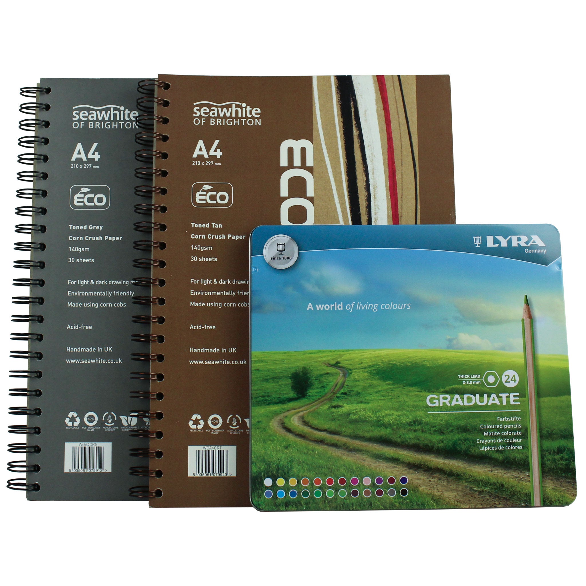 The pad and pencil combination in this set is perfect for beginners or advanced artists. The soft lead can be used for fine detail work or broader expressive pieces. The base colour of the pad being toned gives an initial layer of colour to a piece of work without need for excess shading. The pad featured is also ideal for use with pastels, charcoal and other forms of dry media.