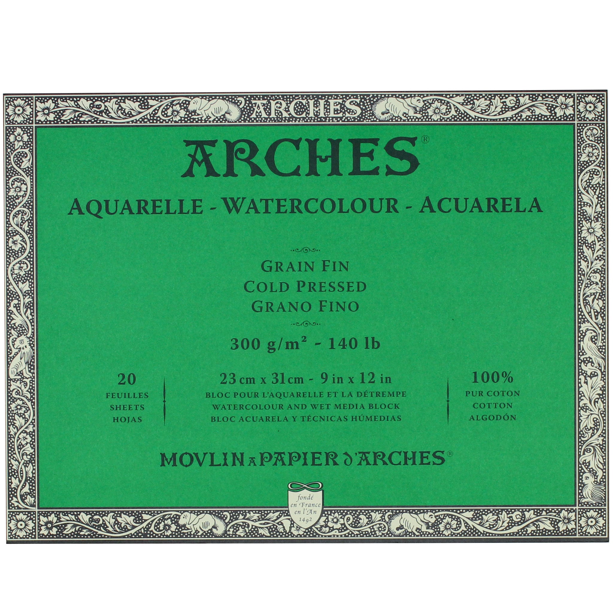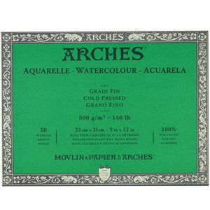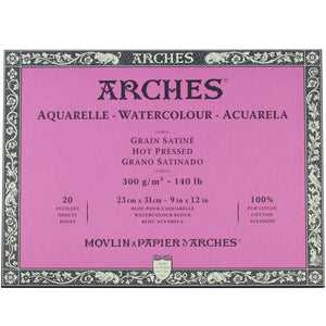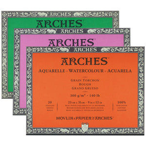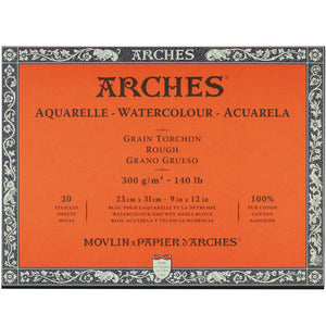 Arches Aquarelle Watercolour Blocks are made and produced with paper from the Arches paper mill in the Vosges, France. The pad contains 20 sheets of Cylinder Mould Made, internally gelatin sized paper. These sheets have a neutral pH size (internally) which makes them genuinely acid-free. Each page is 300gsm (140lb) which is designed to be used with Watercolours. The paper varies in texture with Rough, Hot and Not press available and all paper is white in colour.