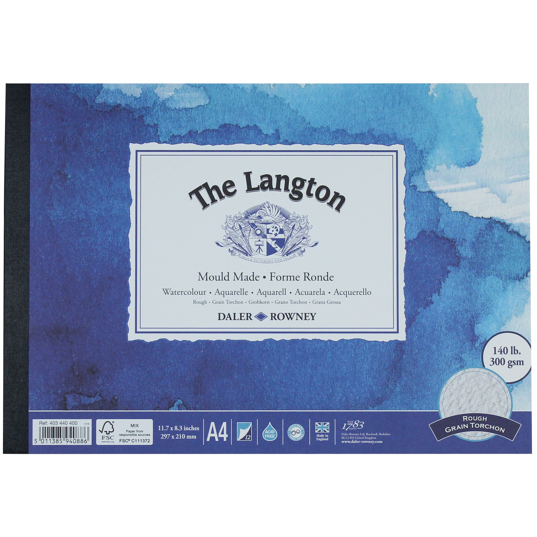 Daler Rowney Langton Watercolour Pads are made and produced with paper from England. The pad contains 12 pages of Cylinder Mould Made, Wood-free paper. These sheets have a neutral pH size (internally) which makes them genuinely acid-free. Each page is 300gsm (140lb) which is designed to be used with Watercolours. The paper varies in texture with Rough, Not and Hot available and all paper is white in colour.