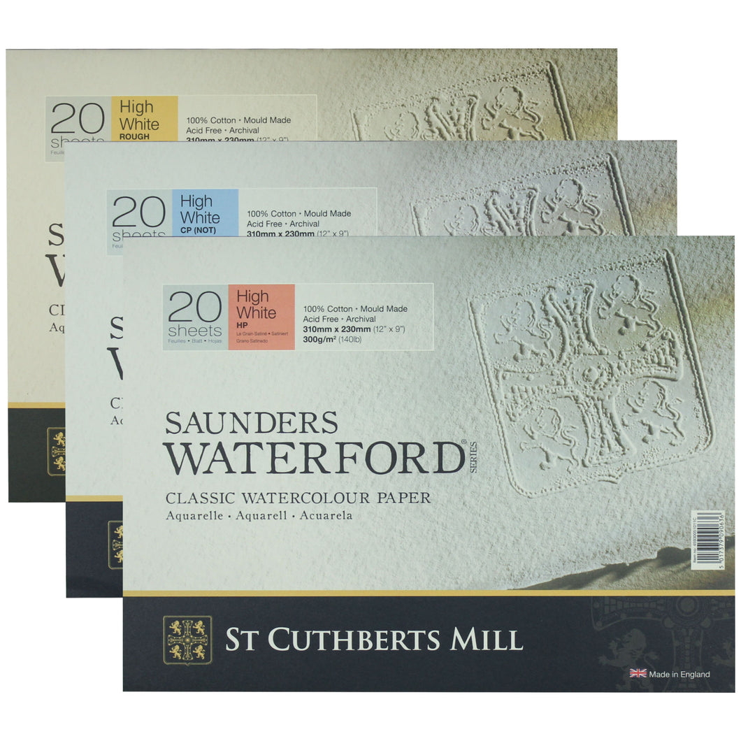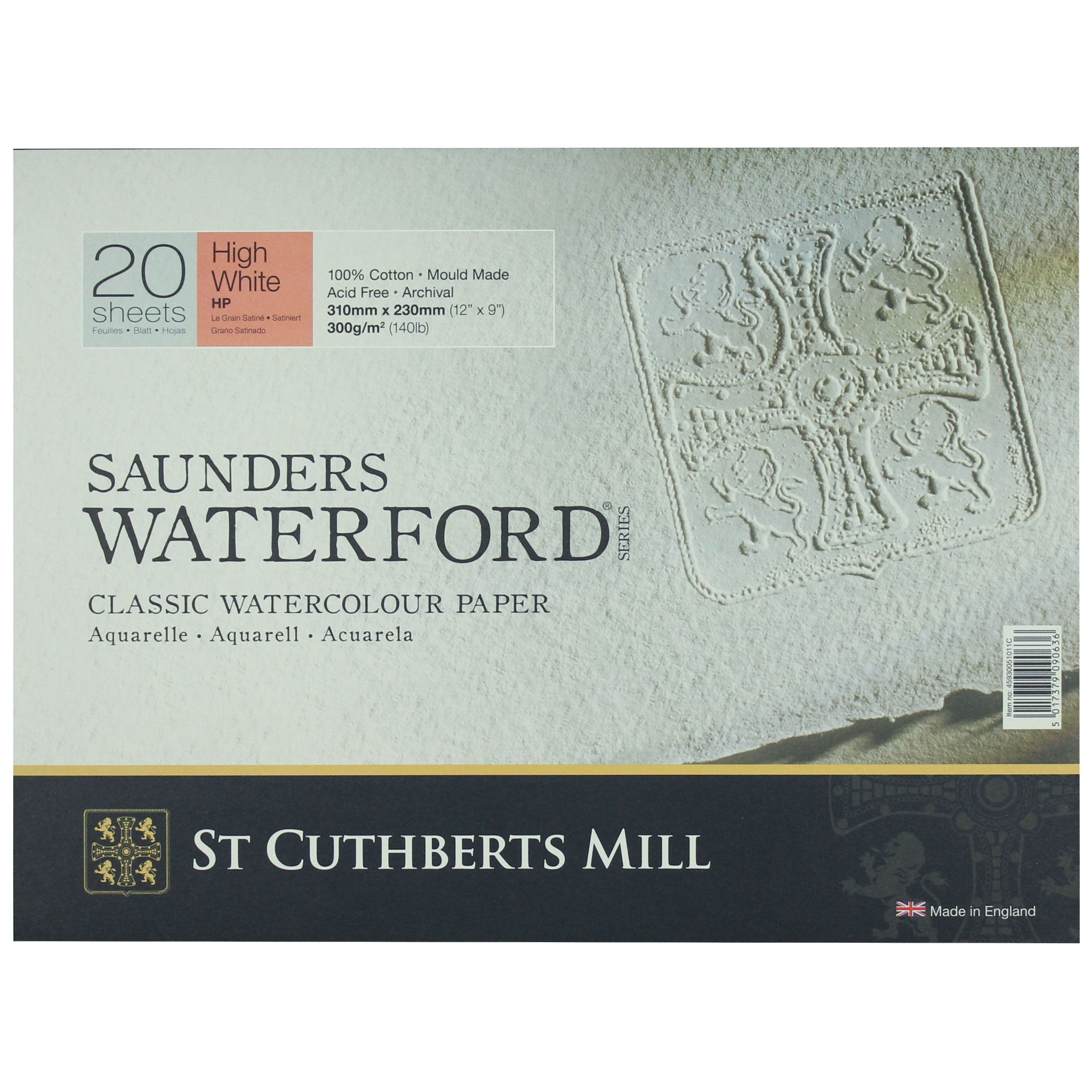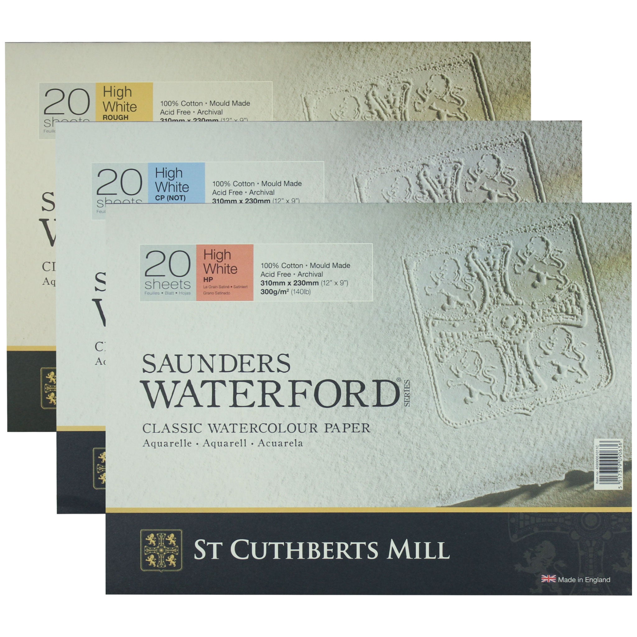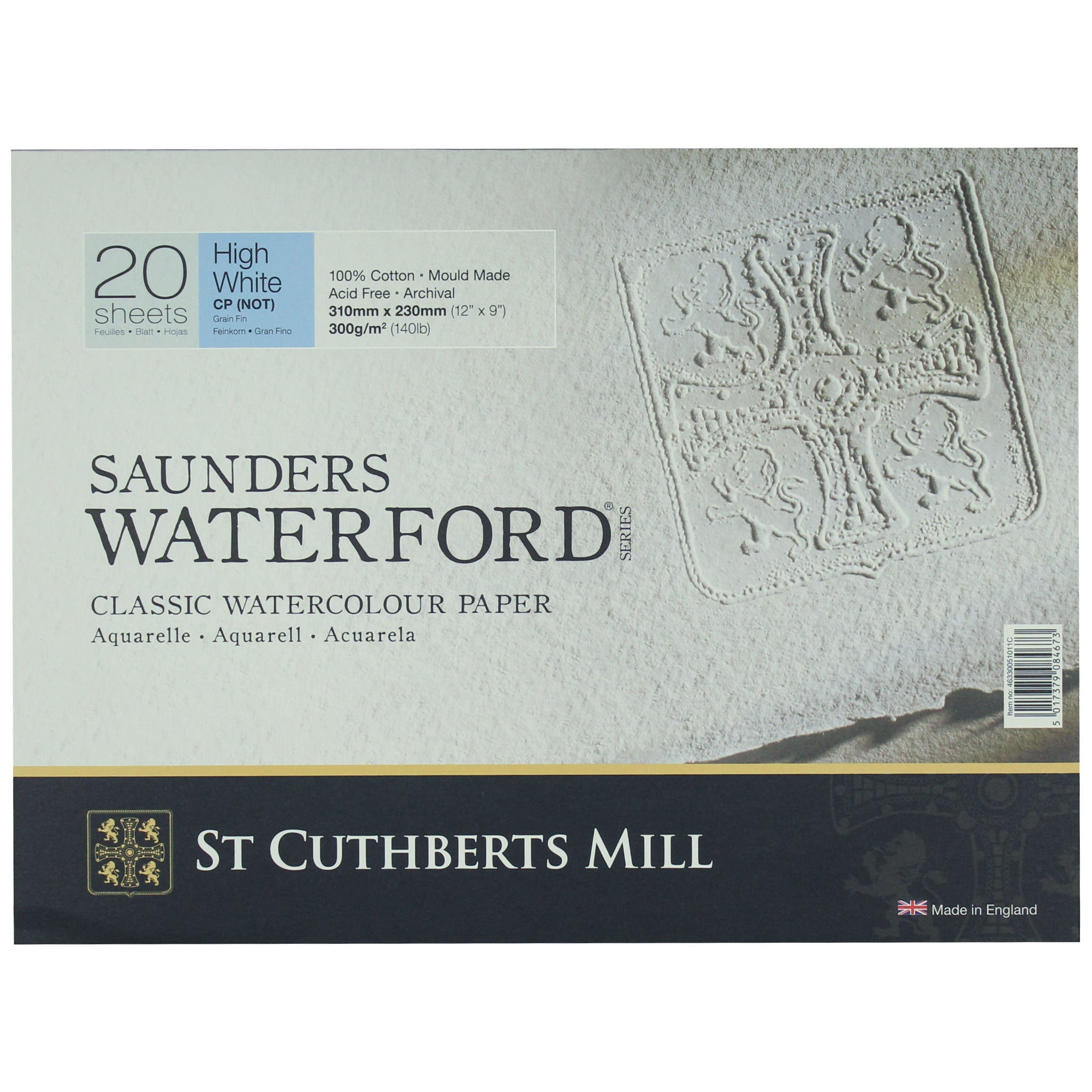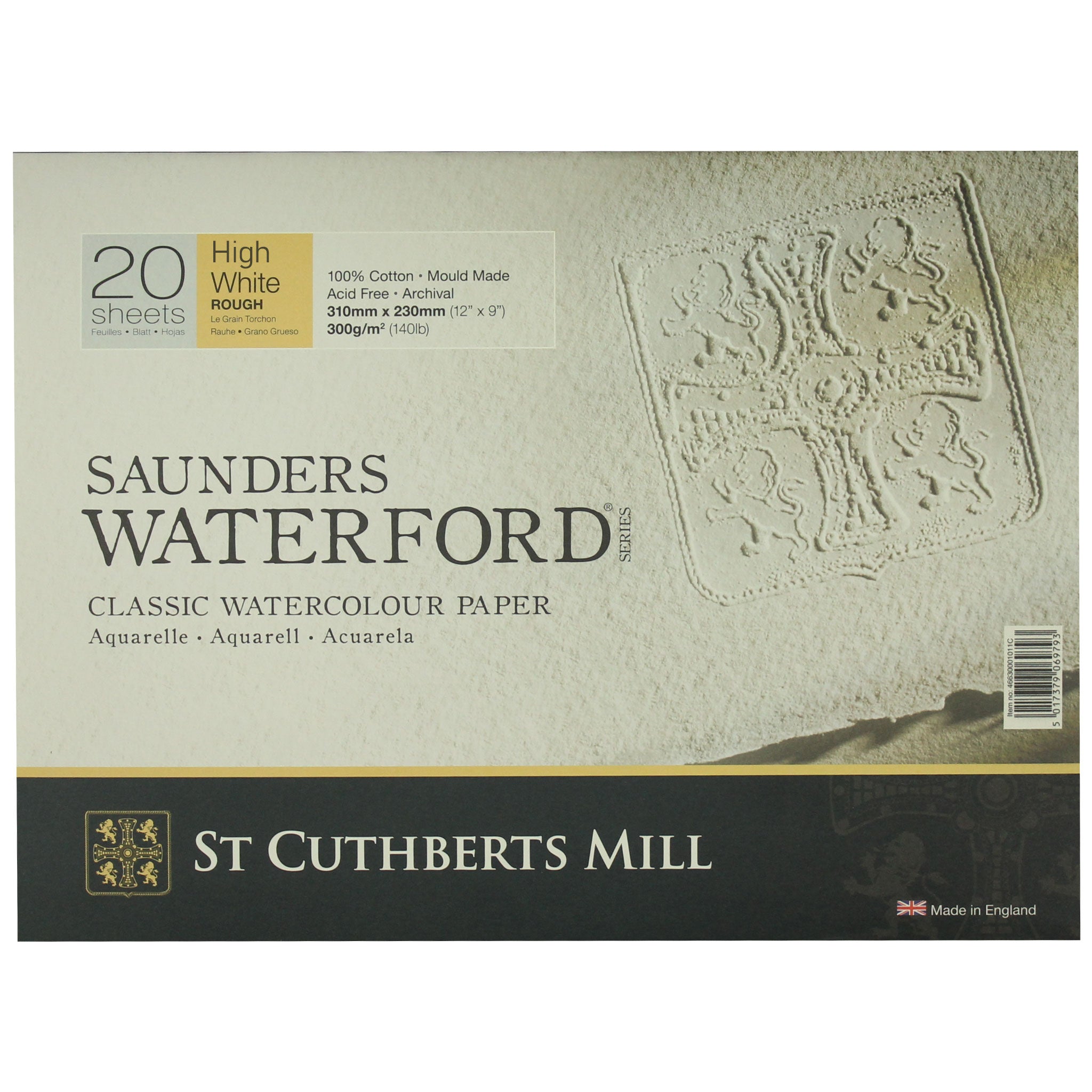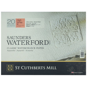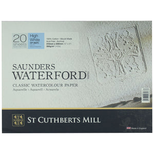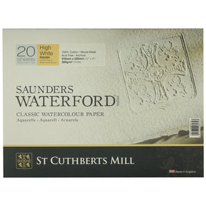Saunders Waterford High White Blocks are made and produced with paper from the St Cuthberts mill in Wells, Southern England. The pad contains 20 sheets of Cylinder Mould Made, 100% cotton paper. These sheets have a neutral pH size (internally) which makes them genuinely acid-free. Each page is 300gsm (140lb) which is designed to be used with Watercolours. The paper varies in texture with Rough, Hot and Not press available and all paper is high white (extra white) in colour.