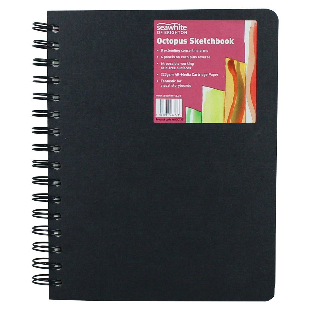 The Seawhite Concertina Octopus Book is cut-edge which provides a clean edge to the paper. The cover is hardback and the book uses a Spiral Bind. The sketchbook features 8 extended folding arms and offers 32 panels to work on. This beautiful design is perfect for long panoramic landscapes.